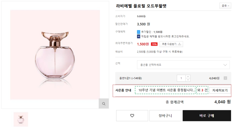 상품 상세페이지에서 해당 상품 구매 시, 사은품으로 설정된 상품의 지급조건 정보를 조회할 수 있습니다.