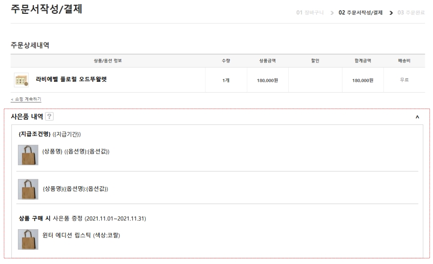 ▽ 예시 화면 (주문서 작성페이지 내 사은품 정보 제공)