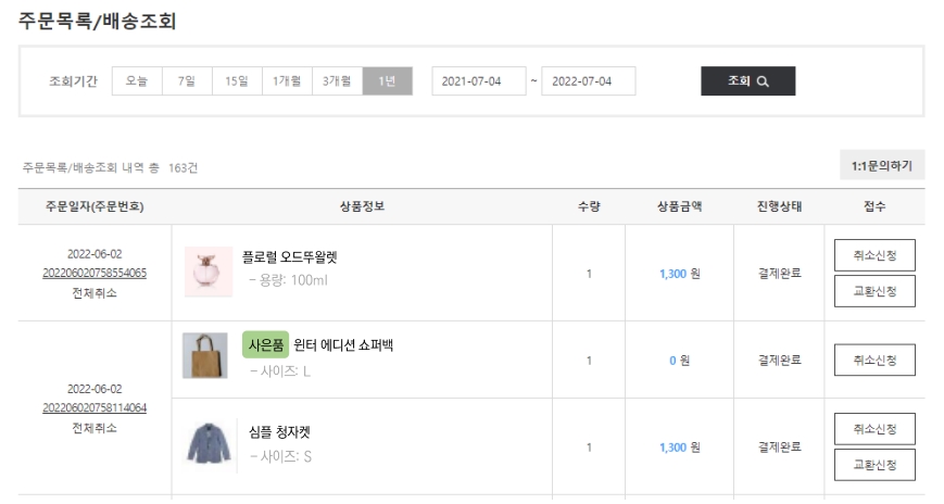 또한 마이페이지 주문내역 화면에서 지급된 사은품 정보 확인 및 클레임 처리 기능을 제공하고 있습니다. 지급된 사은품의 대한 취소/반품 처리가 가능합니다. (※단, 사은품 교환기능 미지원) 다른 상품과 함께 클레임 처리하거나, 사은품 개별 클레임 처리가 가능합니다.