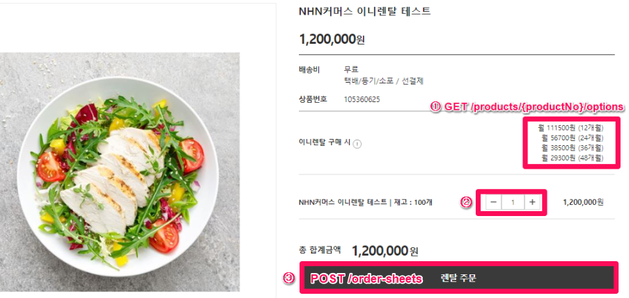 ✔ 해당 API의 Request body 내 rentalInfo(렌탈 상품 정보) 필드값을 통해 월렌탈료 및 렌탈기간을 전달하게 됩니다.