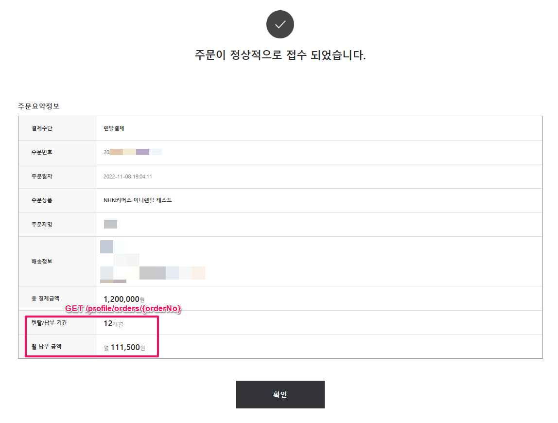 - ✔응답값 내 payInfo > rentalInfo(렌탈정보) 필드 값을 통해, 위 샘플 화면과 같은 주문완료 화면을 구현할 수 있습니다.