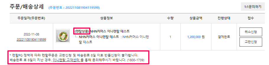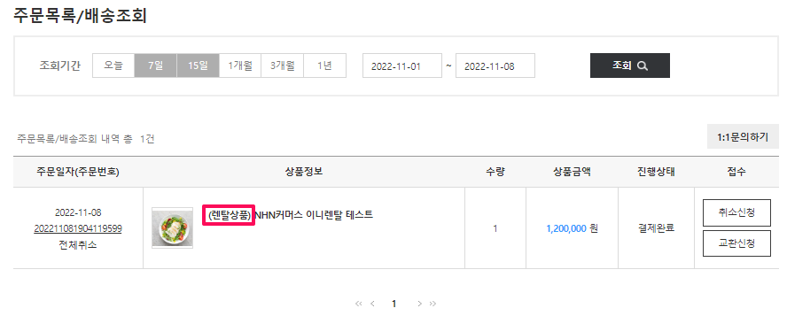 - ✔마이페이지> 주문/취소/반품 내역 화면에서, 결제된 상품이 렌탈상품인 경우 상품명 앞에 (렌탈상품)이 출력되어야합니다.