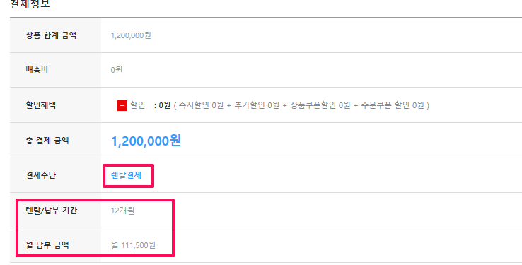 - 렌탈상품 주문건은, 결제수단에 '렌탈결제'가 노출됩니다.