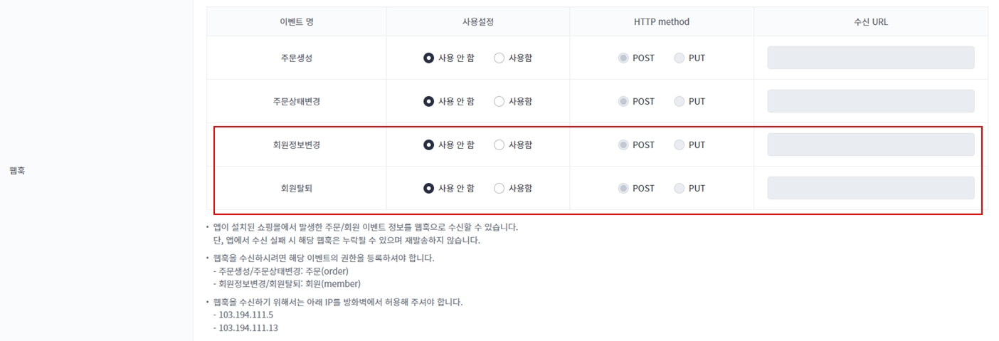 회원정보 변경, 회원탈퇴 웹훅 설정으로 앱이 설치된 쇼핑몰의 회원정보가 변경되거나, 회원탈퇴 발생 시 웹훅을 수신할 수 있습니다.